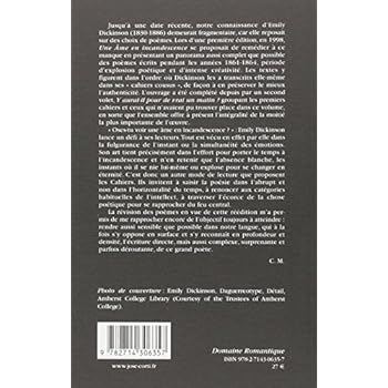Notre connaissance d'Emily Dickinson (1830-1886) demeure encore aujourd'hui fragmentaire, car elle repose sur des choix de poèmes. De tels choix, même s'ils se veulent aussi représentatifs que possible, risquent à la longue de brouiller la réalité profonde du poète. Une autre démarche, face à la diversité des approches consiste à laisser émerger, comme d'elle-même, sa figure unique. D'où le souci de présenter ici au moins la partie la plus essentielle de son ?uvre, par la traduction de la quasi intégralité des poèmes des années 1861, 1862 et 1863, années-phares, période d'explosion poétique et de créativité intense. Les textes figurent dans l'ordre où Emily Dickinson les a elle-même transcrits dans ses " cahiers cousus ". L'ouvrage vise ainsi à la fois à restituer le tissu interstitiel de la poésie et une architecture altérée par des éditions successives. " Oses-tu voir une âme en incandescence ? ". Emily Dickinson lance un défi à ses lecteurs. Tout est en effet vécu par elle dans la fulgurance de l'instant ou dans la simultanéité des émotions. Son art tient précisément dans l'effort pour porter le temps à l'incandescence, n'en retenir que l'absence blanche, les instants où il se nie lui-même ou explose pour se changer en éternité. C'est donc un autre mode de lecture que proposent les Cahiers. Ils invitent à saisir la poésie dans l'abrupt et non dans l'horizontalité du temps, à renoncer aux catégories habituelles de l'intellect, à traverser l'écorce de la chose poétique pour se rapprocher du feu central. C.M.
